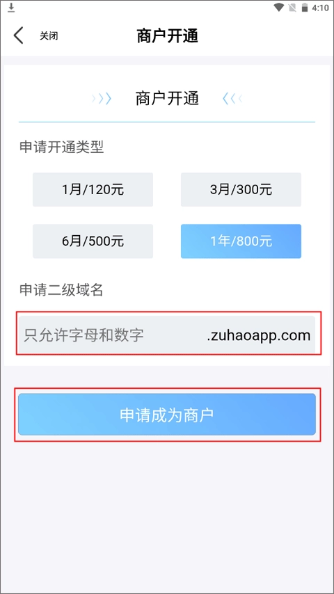 下面就是申请你的网站二级域名,根据提示输入你想好的名称后,点击申请成为商户就可以了,等待工作人员审核通知即可。