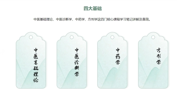 - 涵盖的课程有:中药、方剂、伤寒论、医案分析、穴位定位、黄帝内经等。