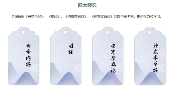 全面解读《黄帝内经》《难经》《伤寒杂病论》《神农本草经》这四部中医经典著作,为学习者提供多维度、系统化的学习支持。