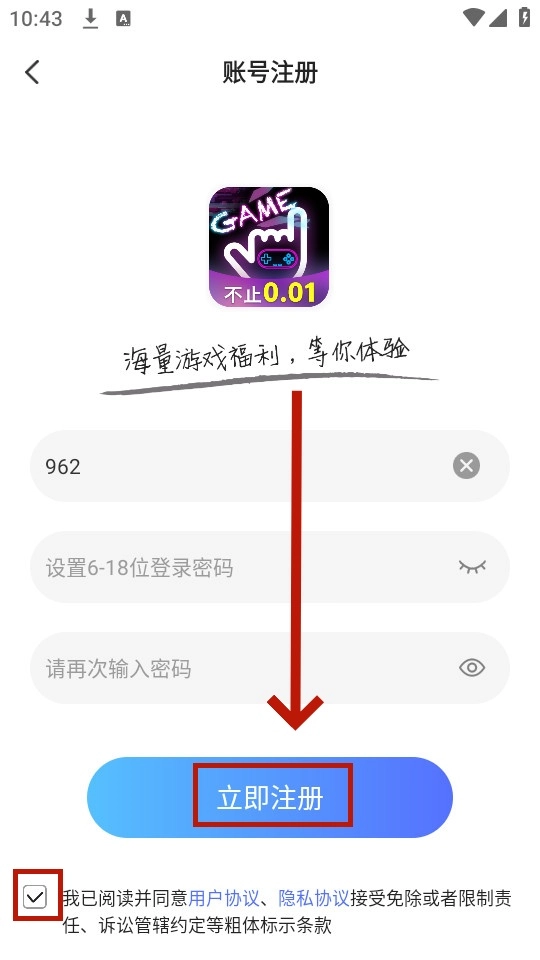 输入信息,勾选协议,