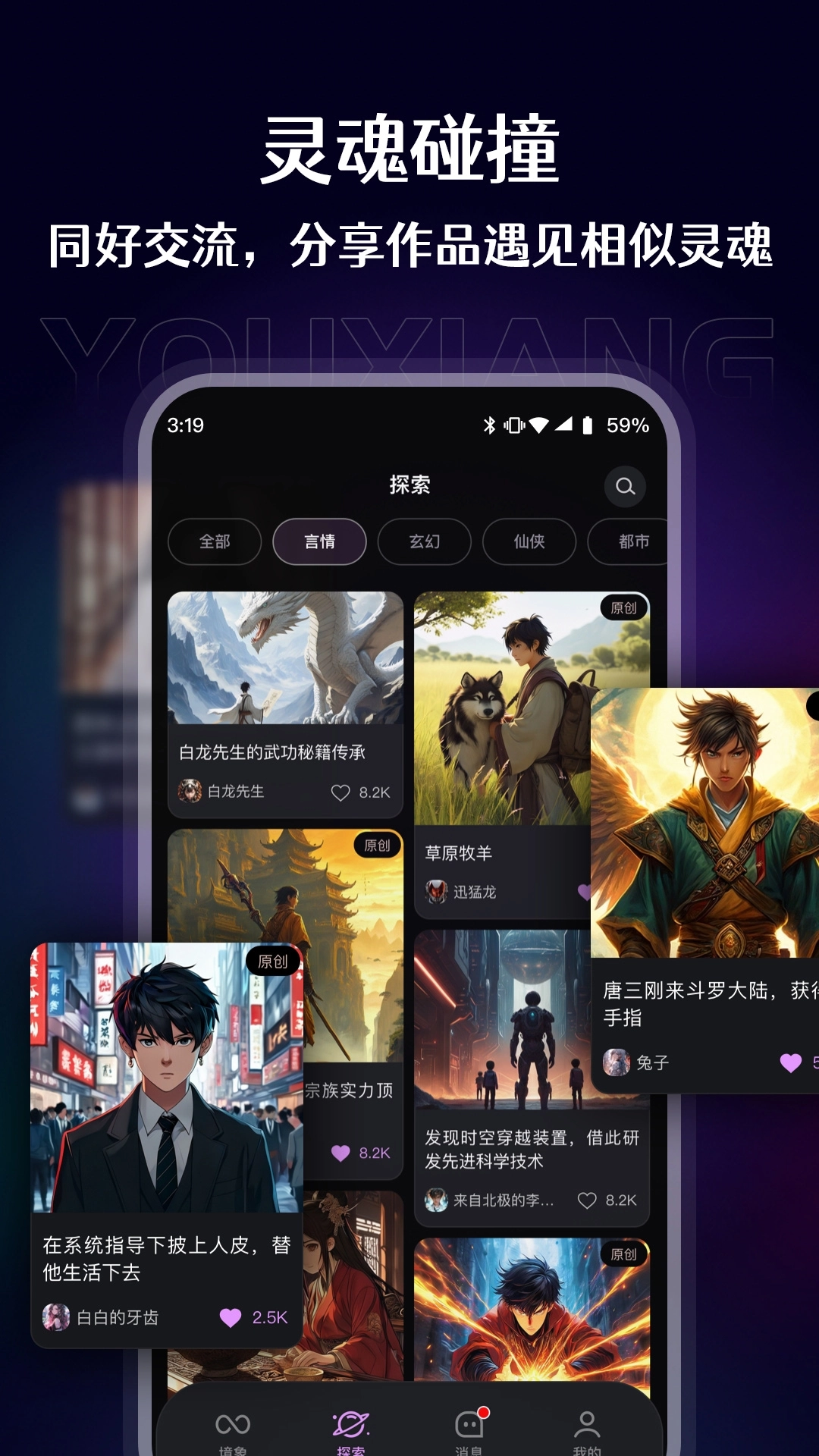 有象,是一款依托AI技术打造的互动阅读社交平台。在这里,故事的情节走向由你掌控,高度自由的设定让每一次选择都充满无限可能!精美的配图让故事更添生动色彩,带你沉浸式穿越到奇幻的境象世界,带来身临其境的独特体验!平台支持多支线无限流的脑洞创作模式,让你的创意与才华尽情释放,在交流中碰撞出灵魂共鸣,轻松找到兴趣相投的伙伴,让分享不再孤单!我们打破了传统互动小说、漫画、网文的阅读局限,为用户带来全新的奇妙阅读体验~