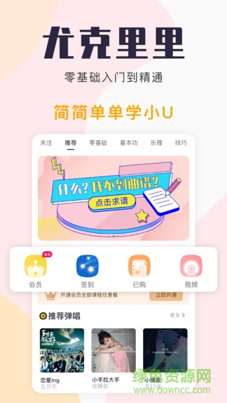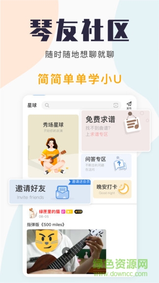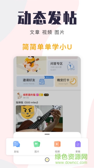 尤克里里自学安卓最新版软件 这里聚集了一群热爱尤克里里的伙伴,你可以观看精彩的弹唱视频,也能发布自己的作品,还能在线学习,更可以和志同道合的朋友交流互动,感兴趣的朋友快来体验吧!