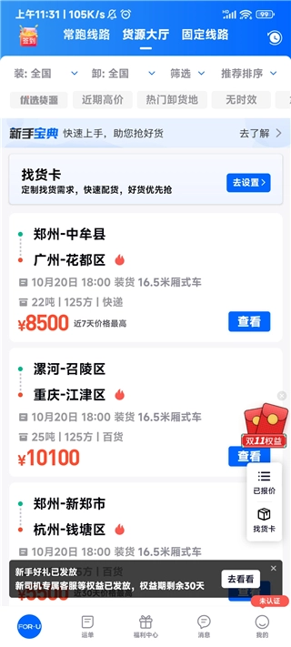 我们会依据您的地理位置、车型、常跑路线等信息,为您智能匹配合适的订单;您也能在“货源大厅”里,按照自身需求进行筛选。