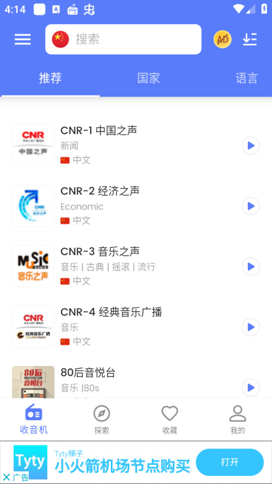 探索:按语言、类型和国家搜索您喜爱的广播电台。