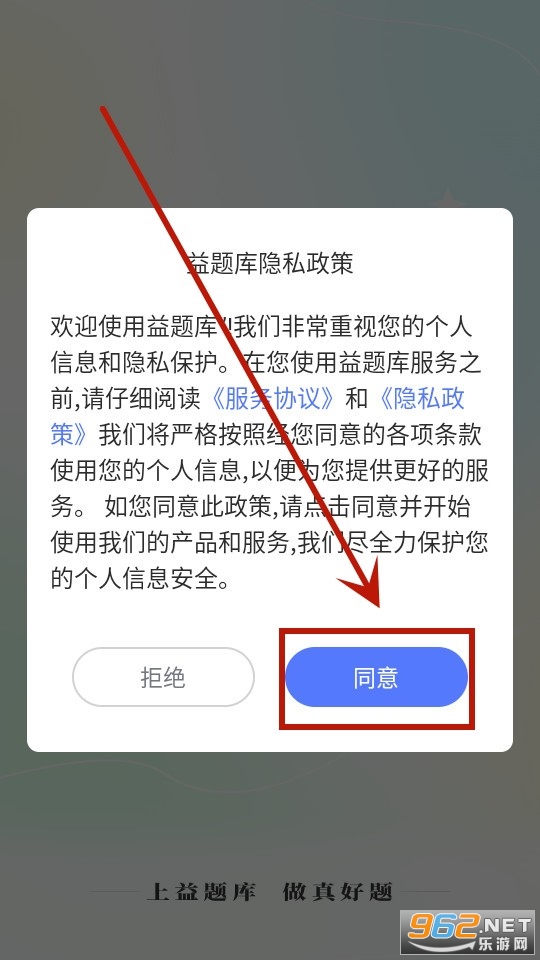 先把社工初级题库安装好并打开它,接着点击【同意】按钮来确认同意隐私政策。