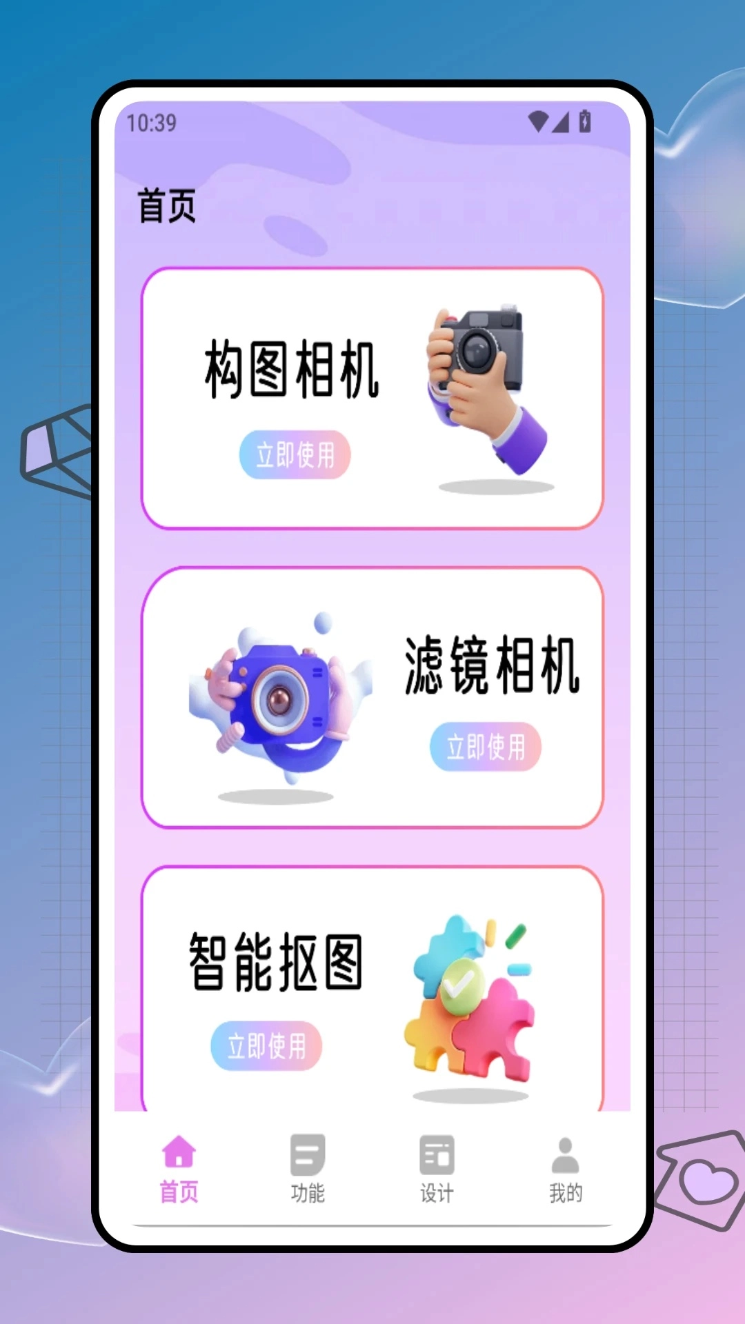 首页配备构图相机、滤镜相机、智能抠图等功能,可满足多样化的拍摄需求。 2. 功能页面涵盖海报制作、贴纸剪裁、宫格切图以及水印去除等实用工具。