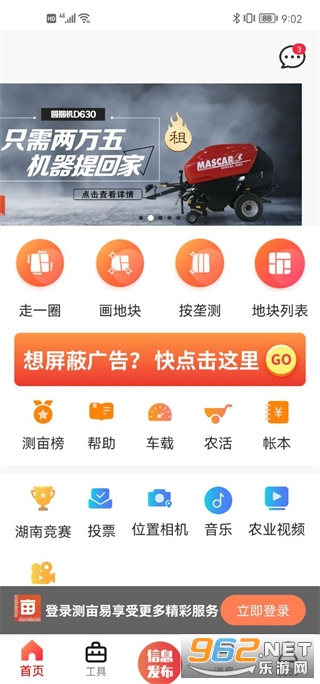首先我们打开测亩易应用,进入首页后能看到走一圈、画地块、按垄测等功能板块,其中前两个板块可供我们直接开展测量操作。