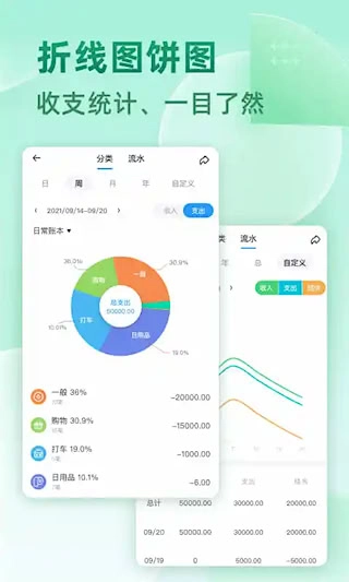 多维度统计支持按周、月、年或自定义周期生成图表,涵盖饼图、趋势图等可视化呈现方式。