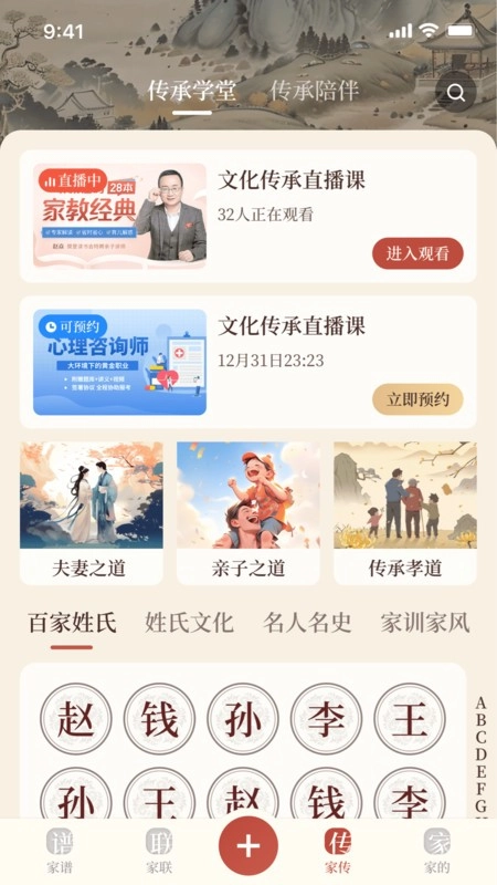 谱传传软件支持在线创建家族树,用户可以查看最新家族公告,加入家族群聊,学习各类传统文化知识;平台还提供贴心的课程直播预告功能,用户能查看详细的家族图谱,并可对分支进行添加与编辑操作。