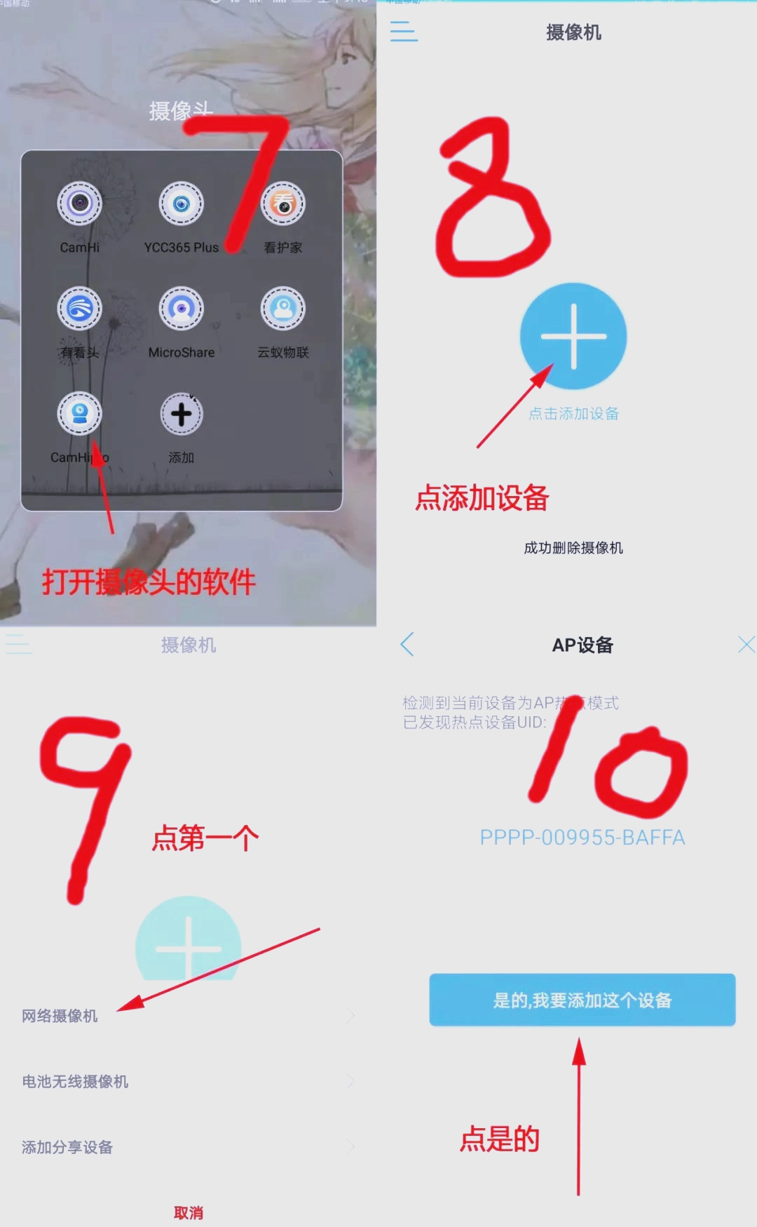 连接上摄像头的热点WiFi后,打开对应的界面,接着依次点击“添加设备”与“网络摄像机”选项,再根据系统给出的提示完成后续操作。