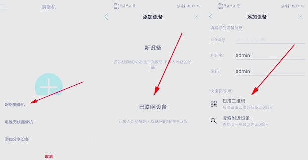 打开手机应用程序,在设备列表里找到并选择“添加网络摄像机”选项,接着点击“已联网设备”,再通过点击“扫描二维码”的方式添加设备,等这些步骤都完成后,设备就成功连接好了。