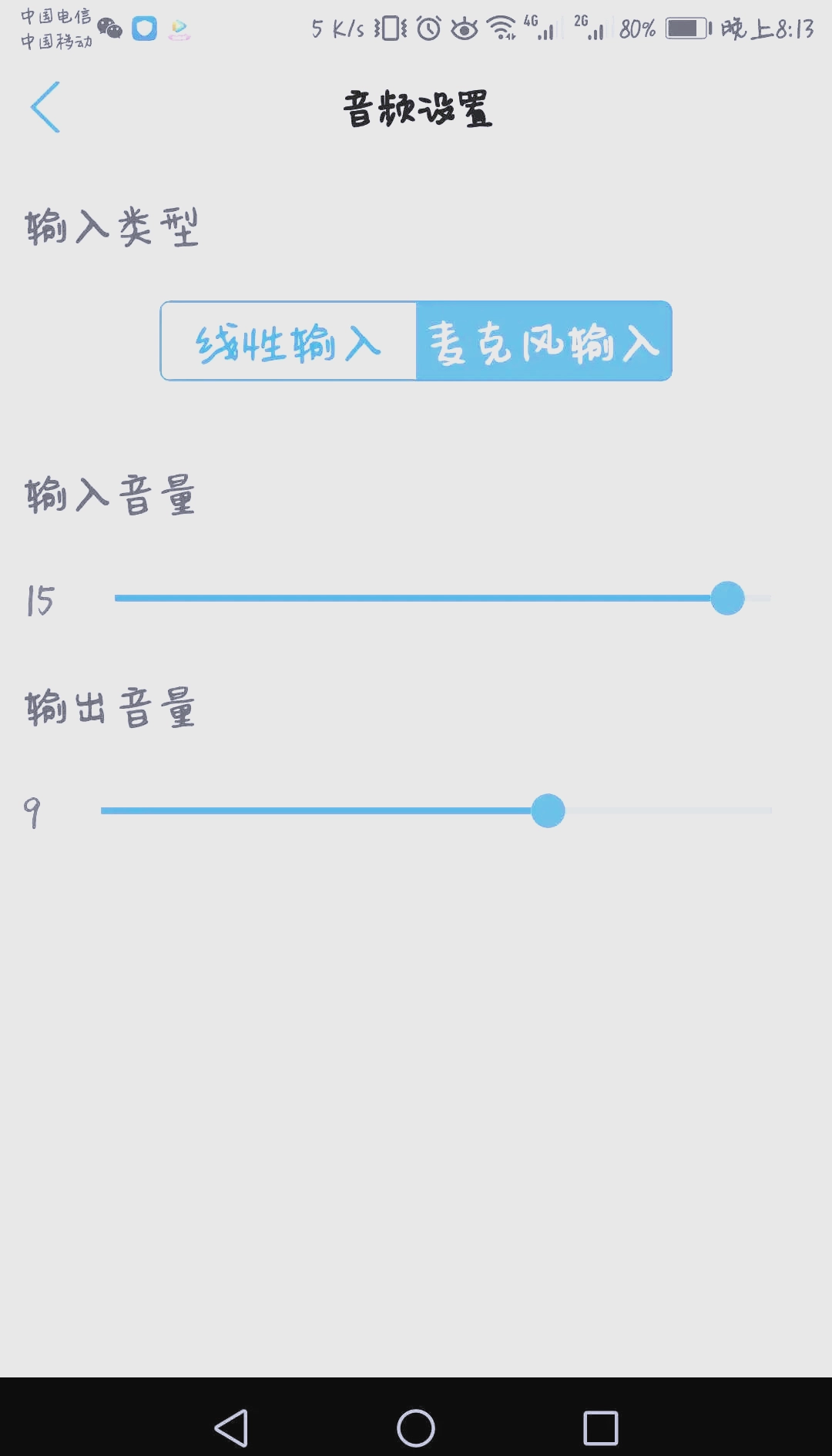 打开应用程序界面后,进入摄像机设置页面,点击音频设置选项,可选择线性输入(该输入方式适用于外置有源拾音器和有源咪头)或麦克风输入(该输入方式适用于无源咪头),此外还能够对输入音量和输出音量进行调节。