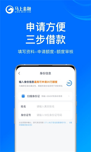 马上金融能为用户提供安全、专业、智能且便捷的贷款服务,同时该软件最高可提供20万元的贷款额度。用户只需安装最新版的马上金融,填写一些基本资料,就能快速获得贷款。