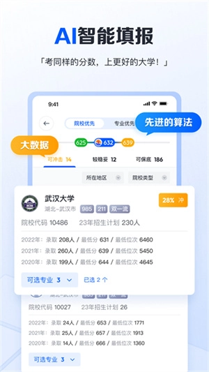 1. 能够迅速提供报表服务,针对用户开展模拟志愿分析,助力其在填报志愿前对自身情况进行评估。
