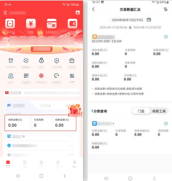 可查看当日的收款金额、交易笔数、结算金额、退款金额、营销补贴(由营销平台配置的活动)、退款笔数等汇总数据,也能通过筛选指定日期来查看这些数据。