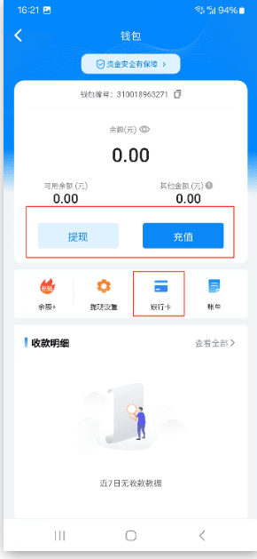 在【钱包】页面点击银行卡选项,即可完成银行卡绑定操作;完成绑定的银行卡,后续可用于账户充值以及资金提现等功能。