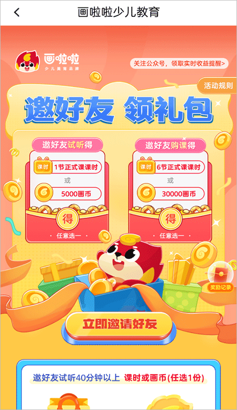 进到画啦啦美术课堂,在首页点击“邀请有礼”