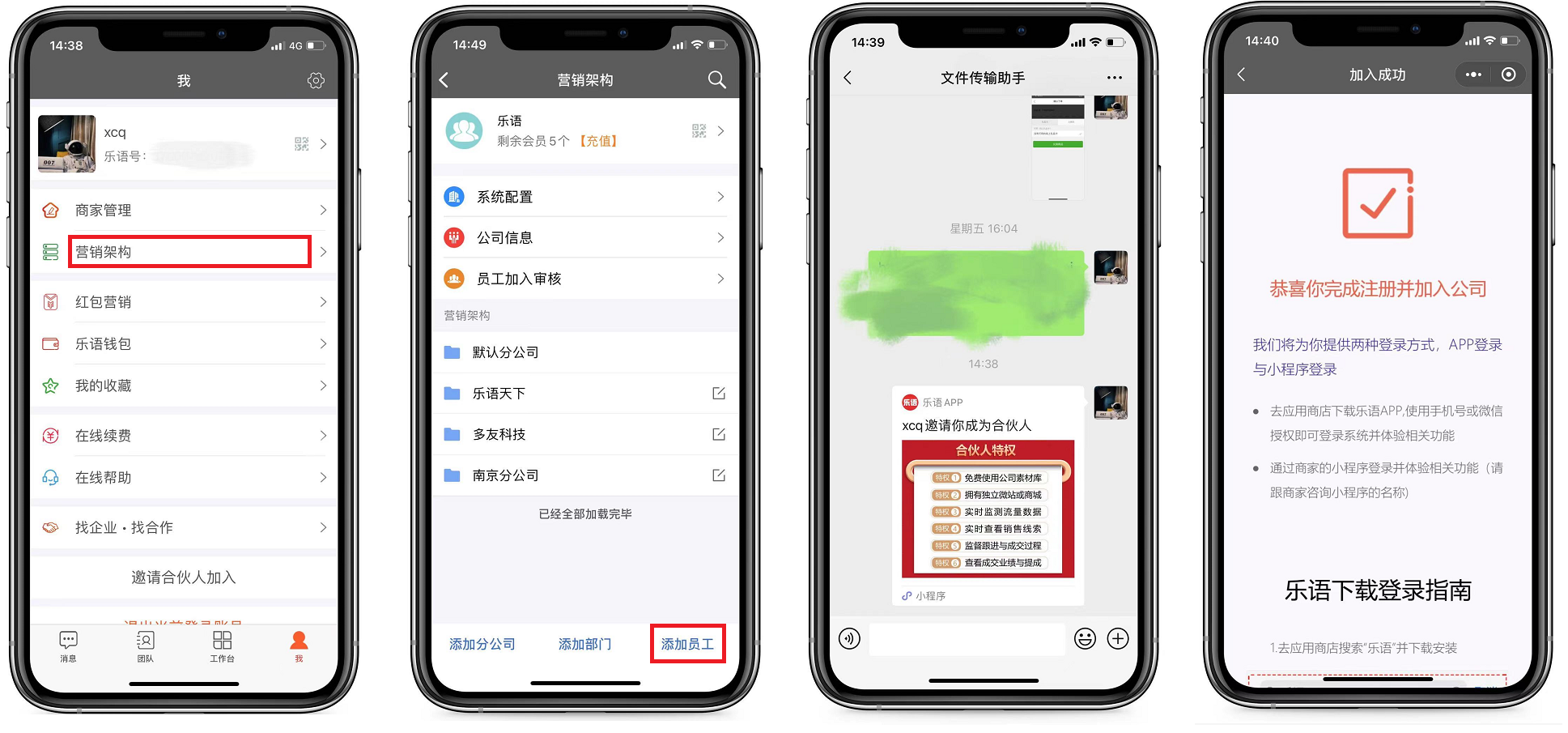管理员账号登录乐语后,进入【我】页面找到【营销架构】选项,点击其中的【添加员工】,就能通过小程序分享的方式将邀请发送给员工。员工只需点击收到的小程序链接,即可完成注册并提交加入申请。而超级管理员用户则可以在【营销架构】里的【员工加入审核】功能中,对这些申请进行审批操作。