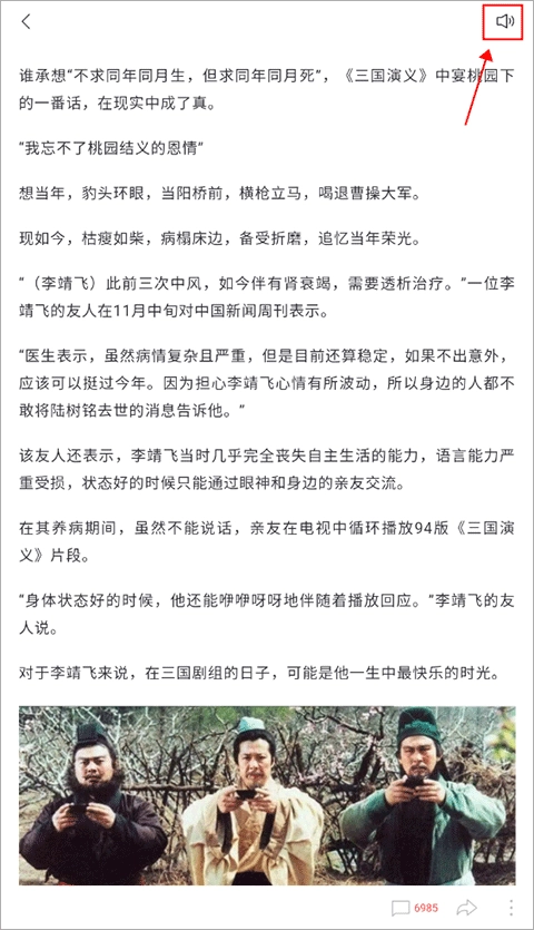 2、找到你想要阅读的文章并点击,接着点击界面右上角的“小喇叭”图标,就能收听新闻了。