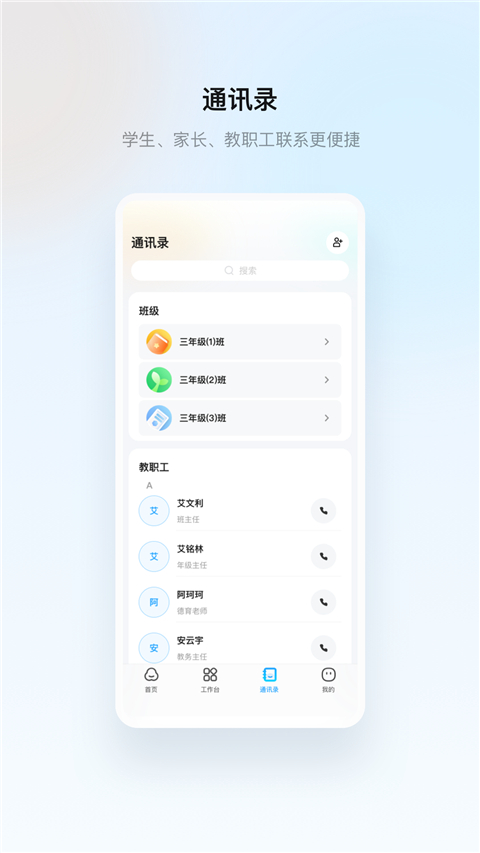 为家长提供离校到校通知、接送服务、班级圈文化建设、学生请假、文字/语音/视频通话、学生体检等服务,让家长能随时了解子女在校情况,助力实现家校共育。