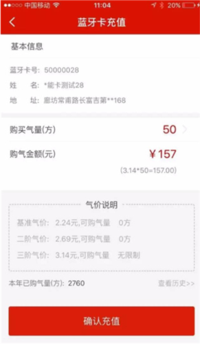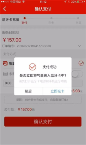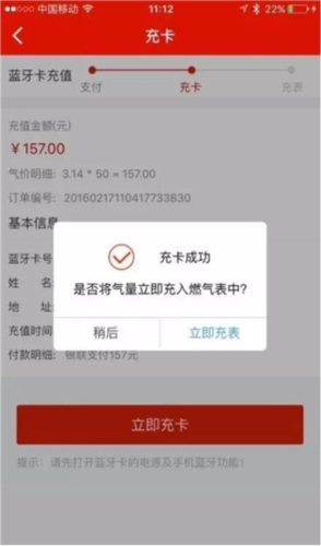 充卡成功后,请点击“立即充表”按钮。等蓝牙卡的蓝灯开始闪烁时,将其插入燃气表内。一旦听到“嘀”的一声,就表示充表操作成功完成啦。
