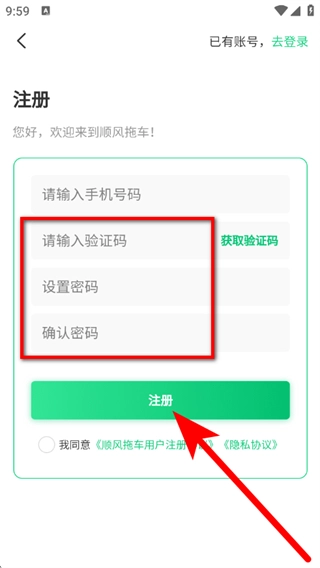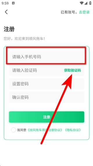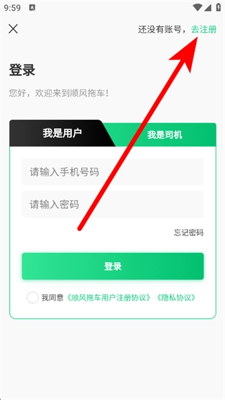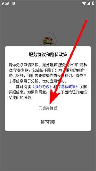 打开顺风拖车应用,待弹出窗口出现后,点击“同意并接受”按钮,即可进入登录界面。