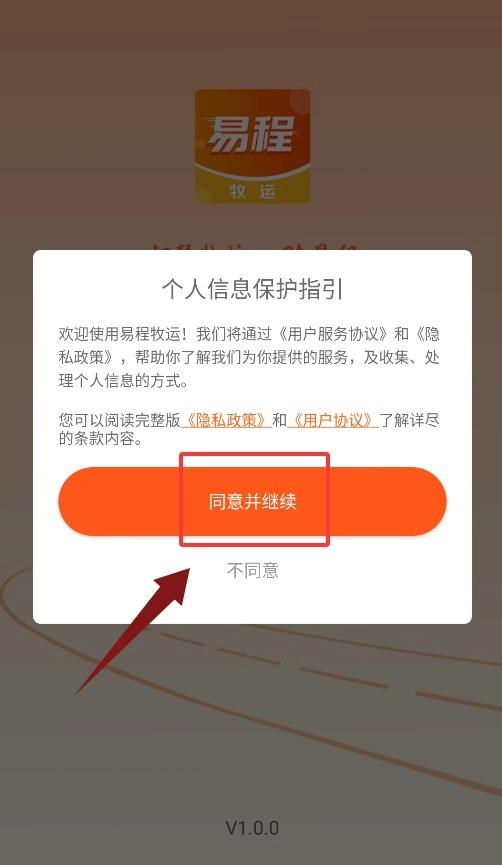 首次打开应用时,需要点击“同意继续”按钮,确认后才能进入主界面。