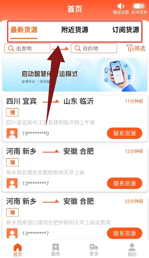 首页呈现最新货源、周边货源以及用户订阅的货源信息。
