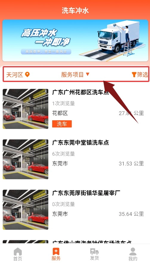 服务界面支持按区域和服务项目进行筛选,方便用户查找洗车、冲水等相关业务。
