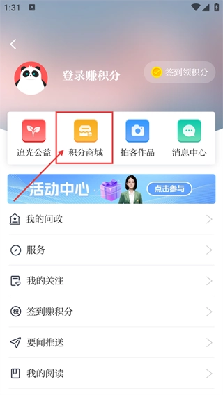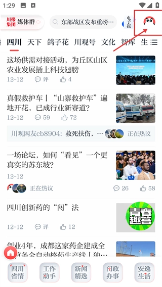 在川观新闻首页,点击右上角的【熊猫图标】,就能进入个人功能聚合页面,这是为后续积分相关操作所做的前置准备。