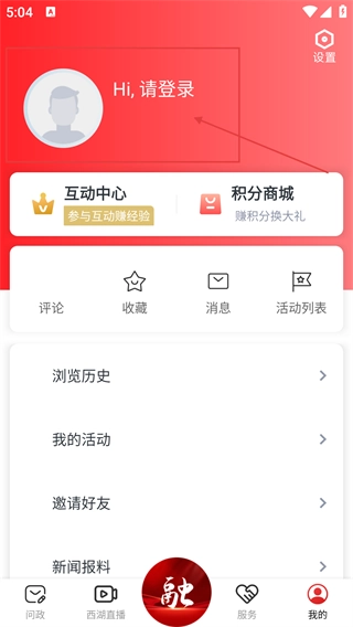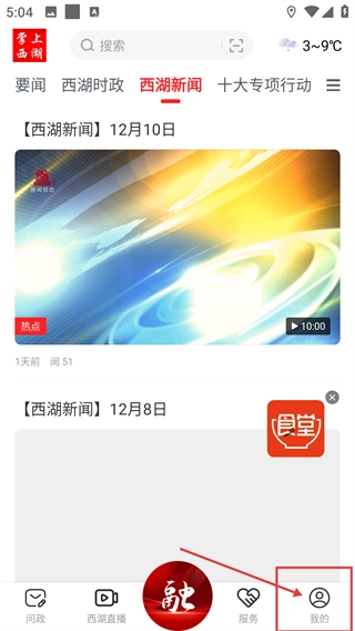 在“掌上西湖”的首页,点击底部导航栏中的【我的】选项,进入个人中心页面,以此为后续的账号登录操作做好前置准备。