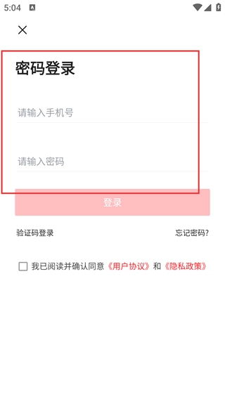 当你选择密码登录的方式时,在对应的界面里输入手机号和密码,接着勾选相关的协议,然后点击登录按钮,这样就能完成账号的登录操作了。