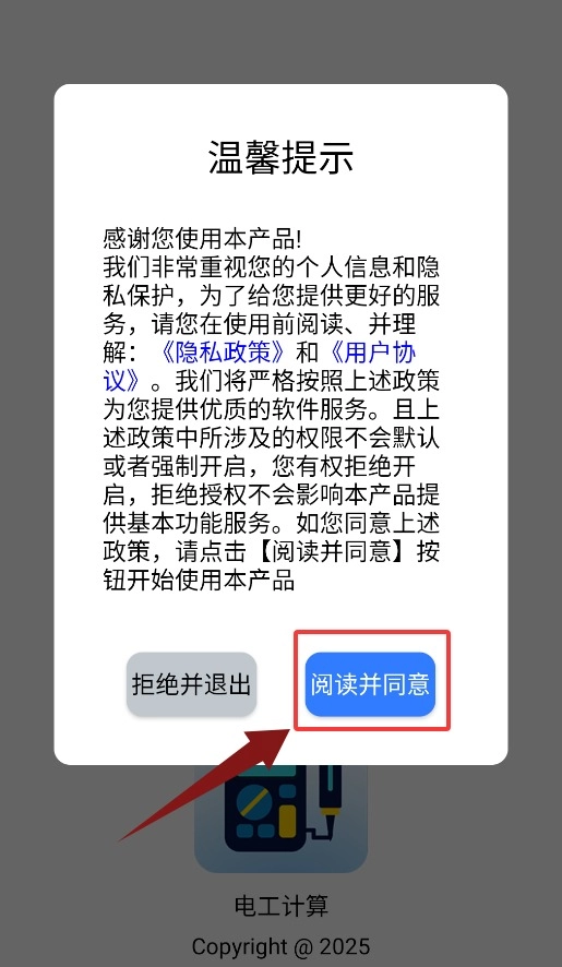 启动应用后会弹出服务协议确认窗口,只有点击同意才能进入主界面。