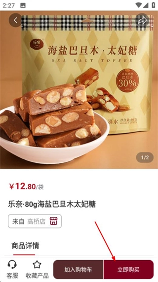 在零食专区页面,找到你想查看的商品(比如海盐巴旦木太妃糖)并点击,就能进入该商品的详情页面了。