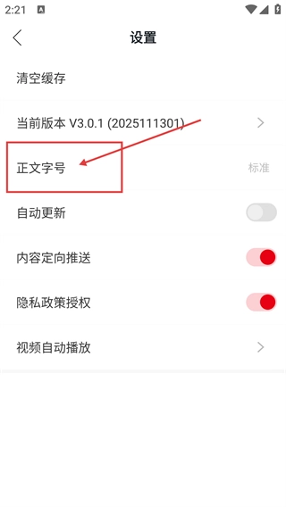 在【设置】页面中,找到并点击【正文字号】这一选项,即可进入字号设置界面,为调整新闻正文的显示字体规格做好准备。