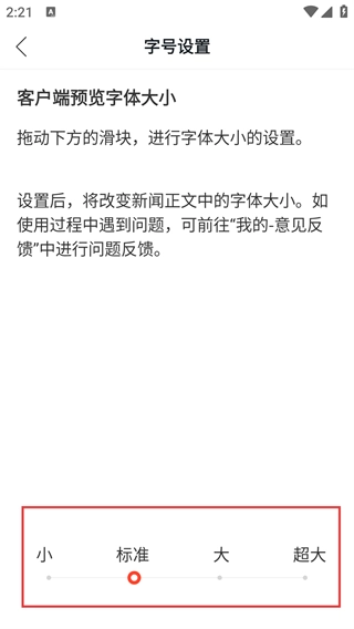 进入【字号设置】界面后,拖动滑块就能在【小】、【标准】、【大】、【超大】这几个字号选项中进行选择,以此来调整新闻正文的显示大小。
