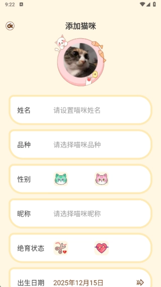在添加猫咪的页面中,能够设置猫咪姓名、品种、性别、昵称、绝育状态、出生日期、到家日期等各类信息,随后进行保存。