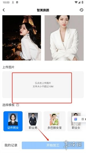 4、就拿“智美换颜”功能来说:上传图片之后,挑选自己中意的模板,接着点击“开始加工”,就能迅速生成效果。
