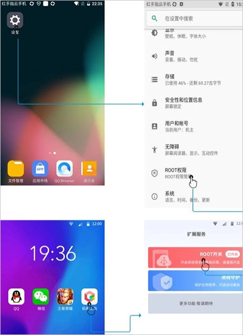 1. 进入云手机,找到设置并点击进入,接着下拉至最底部,找到Root权限,点击后即可进行设置。需注意,若游戏或应用已开启,此时开关root权限,需重启游戏或应用才会生效,每次开关均会弹出停止应用的提示。