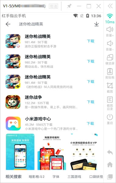 3、进入红手指云手机桌面后,点开云游戏应用市场,在其中搜索“迷你枪战精英”,挑选适合自己游玩的客户端版本,随后就能一键完成【迷你枪战精英】的安装。