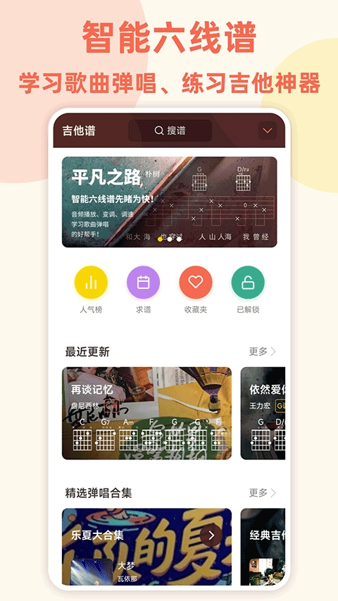 弹唱小吉他ap最新版是一款面向吉他学习者的学习与弹唱工具,用户可直接在手机端开展吉他演奏练习,无需购置价格高昂的实体吉他设备。该软件具备真实的吉他弹奏模拟效果,同时整合了海量吉他谱资源,覆盖多样风格与不同难度等级,方便用户查找心仪曲谱进行演奏;此外,软件还提供了丰富的教学视频内容,学习者能通过观看教程,系统掌握吉他基础技巧、和弦指法、节奏把控等知识,助力快速入门吉他演奏。