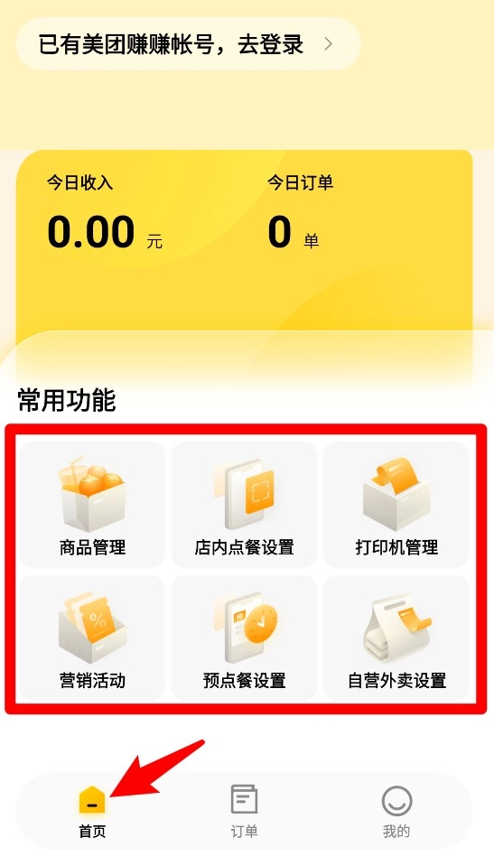 进入首页就能看到今日收入和订单的大致情况,页面下方的常用功能区域里,有商品管理、店内设置等功能入口。
