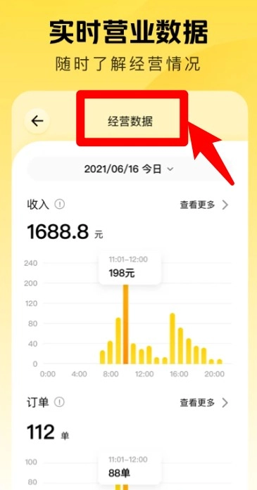 点击“经营数据”选项,即可查看当日的收入及订单详细情况;借助柱状图,还能直观了解不同时段的运营状态。