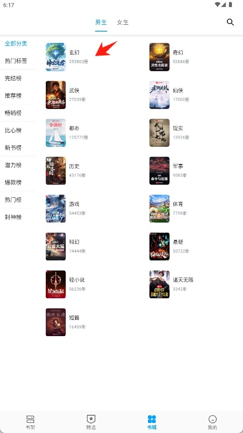 从底部导航栏进入“书城”页浏览作品分类。