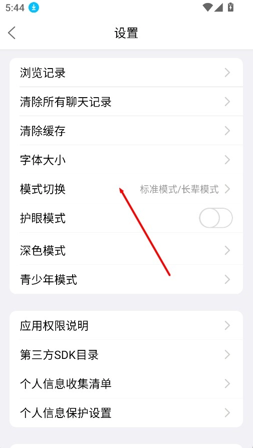 在设置页面里向下滑动,找到“模式切换”这个选项,把当前的模式切换成“长辈模式”,这样界面的内容和字体就会自动调整成适合长辈阅读的样式了。