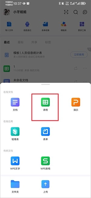 在金山文档首页中点击下方栏目中间的蓝色+号