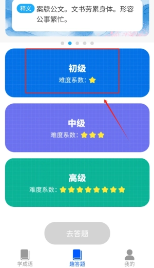 3、选择适宜难度开启答题,以此检验学习成效,强化对成语的记忆与运用能力。