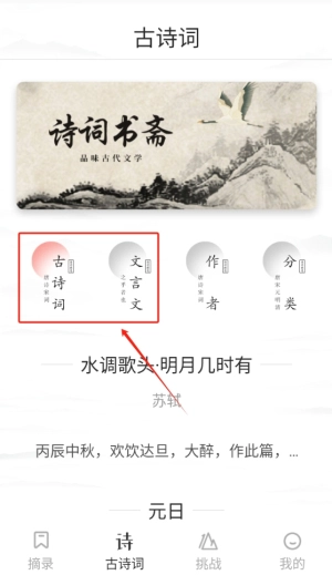 2、选定特定分类后,便着手专注于古诗学习,以提升个人对诗词的理解及欣赏能力。