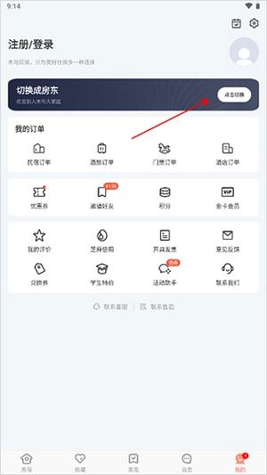1、第一步,打开木鸟民宿,用手机号登录,进入【我的】页面,点击【切换成房东】右侧的【点击切换】按钮。