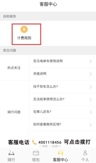 点击底部的【客服中心】选项,进入客服中心页面后,找到并点击【计费规则】,就能查看电单车的收费标准了。